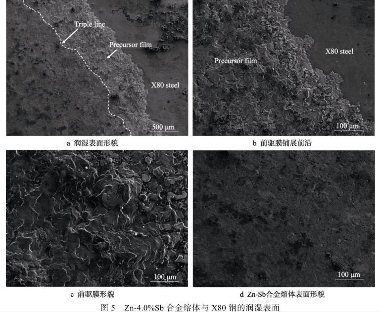 圖5b為前驅(qū)膜鋪展前沿形貌,由于前驅(qū)膜的寬度不均勻,在前驅(qū)膜較寬處Zn-Sb合金熔體流動(dòng)較快,較窄的地方熔體流動(dòng)較慢,因此導(dǎo)致鋪展前沿呈曲折狀。通過(guò)能譜檢測(cè)發(fā)現(xiàn),前驅(qū)膜成分主要是Zn與Fe的反應(yīng)產(chǎn)物,在其表面分布有一定量的Sb元素,且在前驅(qū)膜表面的Sb含量高于Zn-Sb合金熔體表面的Sb含量。分析認(rèn)為,這是由于鋅液表面的活性元素Sb在固/液界面富集,在X80鋼基板表面快速吸附形成薄膜,并在三相線前沿的作用下繼續(xù)向前流動(dòng),產(chǎn)生前驅(qū)膜。前驅(qū)膜的形成使得之后的鋅合金熔體在前驅(qū)膜上鋪展,鋪展到前驅(qū)膜的位置時(shí),產(chǎn)生新的前驅(qū)膜,直到界面達(dá)到平衡停止鋪展。
