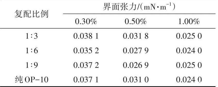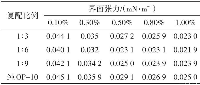 將HPAM配制成質(zhì)量分數(shù)為0.10%的水溶液,與不同濃度的OP-10按不同比例復配,并測定不同復配體系的界面活性,結(jié)果見表3。