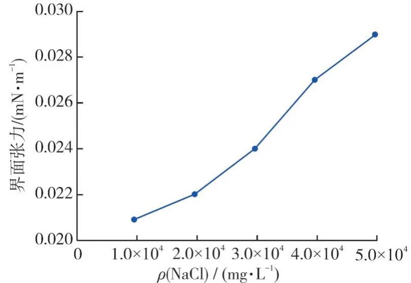 由圖4和5可知:隨著Na+濃度的增加,復配體系的油水界面張力值雖然不斷上升,但是當?shù)V化度上升至50 000 mg/L時,界面張力值增幅很小,僅增加了0.008 mN/m。當Ca2+質(zhì)量濃度增加至1 000 mg/L時,界面張力值增幅也很小,僅上升了0.007 mN/m。這兩種現(xiàn)象證明了隨著礦化度的增加,復配體系仍然具有較好的抗鹽性能,這也正是非離子表面活性劑的特點。
