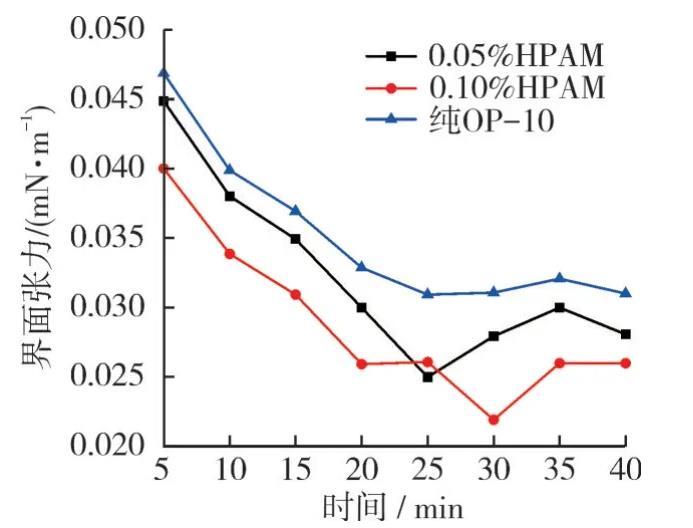3)與純OP-10相比,0.05%和0.10%質(zhì)量分數(shù)的HPAM與OP-10的復配體系的界面張力最小值和穩(wěn)定值都有所下降,且隨著HPAM質(zhì)量分數(shù)的增加,界面張力降低更為明顯,進一步證明了HPAM與OP-10之間確實發(fā)生了相互作用,存在一定的協(xié)同效應。