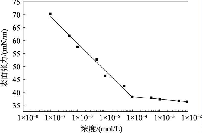 配制不同濃度TAC水溶液,測(cè)定溫度298.15 K,繪制溶液的表面張力隨濃度的變化曲線。在某一濃度前后,表面張力-濃度曲線會(huì)形成兩條斜率不同的直線,這兩條直線的交點(diǎn)即為臨界膠束濃度(CMC)。