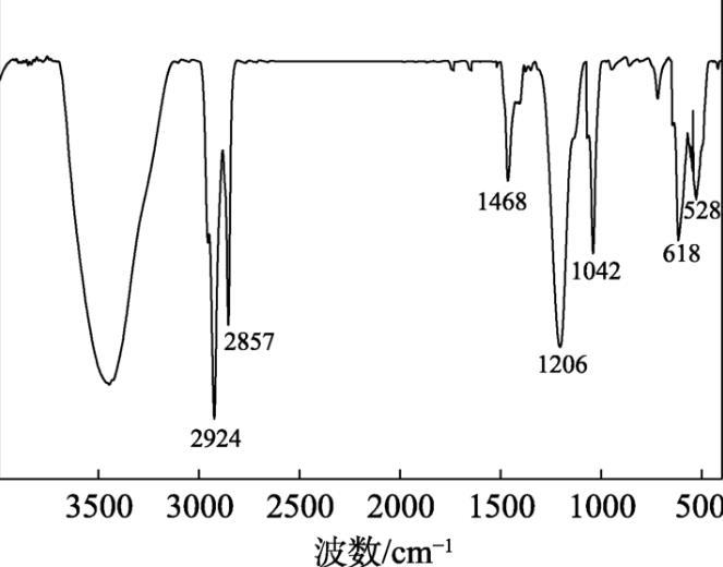 圖1為TAC的FTIR譜圖。從圖1可以看出,2924 cm–1處為主鏈甲基的C—H鍵的伸縮振動(dòng)吸收峰;2857 cm–1處為主鏈亞甲基C—H鍵的伸縮振動(dòng)吸收峰;1468 cm–1處為甲基和亞甲基C—H鍵的面內(nèi)搖擺振動(dòng)吸收峰;1206 cm–1為磺酸基團(tuán)中C—S鍵的不對(duì)稱伸縮振動(dòng)吸收峰;1042 cm–1處為胺基C—N鍵的面內(nèi)彎曲振動(dòng)吸收峰,表明TAC結(jié)構(gòu)中存在季銨基。618和528 cm–1處為—SO 3-的中強(qiáng)吸收峰,表明TAC結(jié)構(gòu)中存在磺酸基。上述結(jié)果表明,TAC符合預(yù)先設(shè)計(jì)的結(jié)構(gòu)。