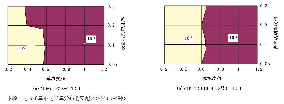 2)同分子量不同當(dāng)量分布的表面活性劑界面活性范圍從圖8和圖2對比可以得出,表面活性劑平均相對分子量為432時,C18-6測得表面活性劑與堿濃度范圍很寬的超低界面活性范圍,而C16-8(2號)超低界面活性范圍的堿濃度相對于C18-6變窄。同理,在試驗用表面活性劑的復(fù)配體系中,試驗圖9表明平均相對分子量為425時,C16-7與C18-6的復(fù)配體系形成超低界面活性范圍寬于C16-7與C16-8(2號)的復(fù)配體系。說明平均相對分子量相同當(dāng)量分布不同的表面活性劑界面活性范圍也不相同。