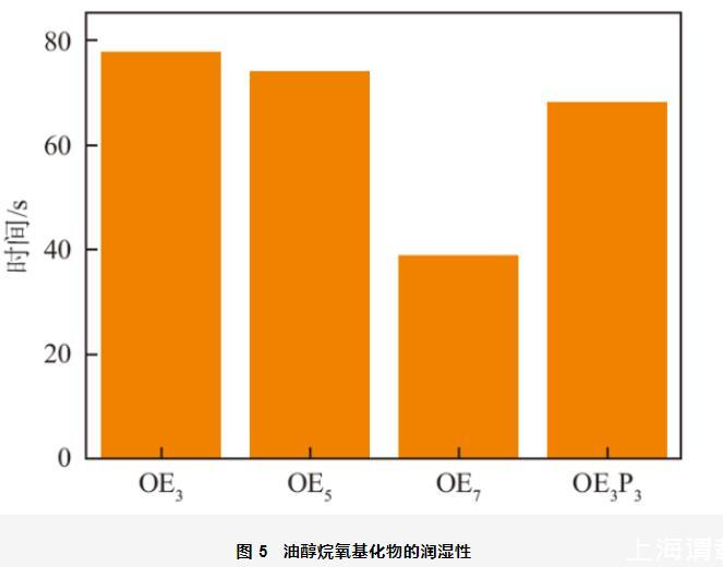 采用帆布片沉降法進(jìn)行潤濕性測定過程中,帆布片在表面活性劑溶液中的沉降時(shí)間越短,潤濕力越好。0.01 mol/L油醇烷氧基化物的潤濕性如圖5所示。從圖中可以看出,隨著EO加合數(shù)的增加,OEn的潤濕時(shí)間逐漸減小,潤濕性逐漸增強(qiáng)。當(dāng)帆布片浸入表面活性劑溶液中后,表面活性劑首先從溶液中快速遷移到纖維表面形成有效吸附層,表面活性劑的尾鏈會(huì)吸附在疏水表面上,而親水頭基朝向水相產(chǎn)生親水現(xiàn)象,有利于潤濕。EO基團(tuán)為親水基,分子結(jié)構(gòu)中EO基團(tuán)越多,表面活性劑分子與水的相互作用越強(qiáng),潤濕性越強(qiáng)。當(dāng)在OE3中引入PO基團(tuán)后,潤濕時(shí)間由78 s降低至68 s,潤濕性增強(qiáng)。PO基團(tuán)為中等極性基團(tuán),分子中引入PO基團(tuán)后,既不減弱分子的親水性又提高了其疏水性,使其與纖維的相互作用增強(qiáng),同時(shí)PO基團(tuán)的支化結(jié)構(gòu)有利于其在織物表面的滲透,增強(qiáng)了潤濕性。表面活性劑分子在水溶液中遷移的速率越快(動(dòng)態(tài)表面活性越強(qiáng)),越容易擴(kuò)散到纖維表面,越有利于潤濕。油醇烷氧基化物的潤濕性順序?yàn)椋篛E3<OE5<OE3P3<OE7,與動(dòng)態(tài)表面張力測定結(jié)果一致。