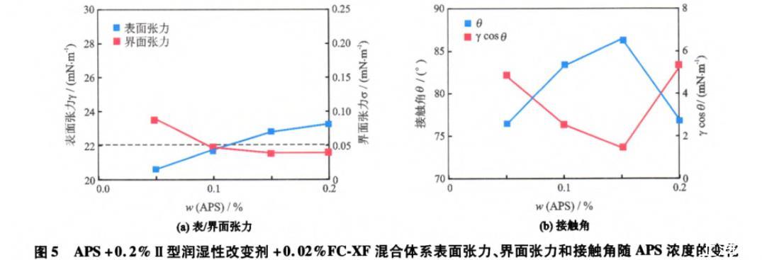 從圖5(a)中可以看出,隨著APS質(zhì)量分?jǐn)?shù)的增加,體系的表面張力增大,界面張力減小,這與FXCF對(duì)表/界面張力的影響機(jī)制相同。從圖5(b)中可以看出,隨著APS質(zhì)量分?jǐn)?shù)的增加,體系與巖石的接觸角先增加再減小,相應(yīng)的γcosθ先減小再增大,均出現(xiàn)極值點(diǎn),這與圖4(b)的變化趨勢不同。這是因?yàn)槲舰蛐蜐櫇裥愿淖儎┖虵C-XF使得巖石表面由水濕轉(zhuǎn)變?yōu)槿跤H水性潤濕(接觸角<75°),更易于吸附APS的親水頭基而使碳?xì)滏溤趲r石表面暴露,這降低了巖石表面的親水性,因而隨著APS質(zhì)量分?jǐn)?shù)的增加接觸角增大。但是,當(dāng)APS質(zhì)量分?jǐn)?shù)大于0.15%后,過多的APS分子可能在巖石表面發(fā)生雙分子層吸附或因競爭吸附而降低Ⅱ型潤濕性改變劑的吸附量,使得巖石表面的親水性增加。而且,接觸角的變化決定了γcosθ的變化趨勢,因而接觸角和γcosθ隨APS質(zhì)量分?jǐn)?shù)的變化曲線中均出現(xiàn)極值點(diǎn)。