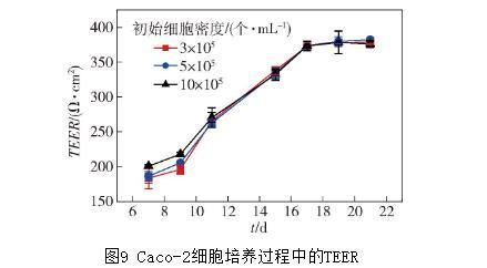 單層Caco-2細胞模型的完整性和致密性可以通過TEER進行評估。一般情況下,認為當單層細胞的TEER高于300Ω·cm2時,單層Caco-2細胞就可以用于進一步的實驗。圖9為不同初始密度的單層Caco-2細胞兩側的跨膜電阻隨培養時間的變化情況。由圖9可知,整個實驗周期,單層Caco-2細胞的初始接種密度對最終電阻的影響不大。前期細胞跨膜電阻變化緩慢,培養9 d后,跨膜電阻出現大幅度增長,在培養17 d后的電阻趨于穩定,最后的電阻穩定于375Ω·cm2附近,表明單層Caco-2細胞模型具有中度緊密度。