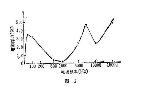 測試條件:水流速v=0.745m/s;水溫T=18.0±0.3℃;電場頻率3.5MHz;用長春市自來水。測試時間為1984年9月21日。電水的浮力和時間關系見圖3。