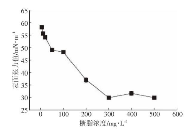發酵產物臨界膠束濃度是指分子在溶劑中締合形成膠束的最低濃度。臨界膠束濃度(Critical micelle0.005 concentration,CMC)可以作為表面活性劑表面活性的一種度量,CMC越小,改變表/界面性質,起到增溶、乳化等所需的濃度就越低。從圖3可以看出:糖脂在0~300 mg·L-1時,表面張力值隨著糖脂濃度的升高而降低,且在300 mg·L-1時達到最小值;在300~500 mg·L-1時,表面張力值變化不大??傻冒l酵粗提產物的CMC為300 mg·L-1,明顯低于普通化學表面活性劑十二烷基磺酸鈉(SDS)的2200 mg·L-1,能在較低濃度下使用,因而在醫藥、食品、化工等行業具有廣闊應用前景。