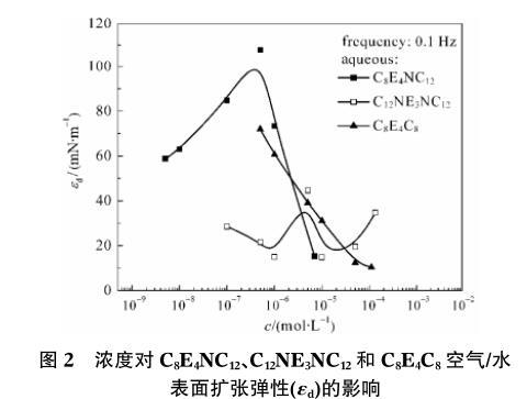 圖2濃度對C8E4NC12、C12NE3NC12和C8E4C8空氣/水表面擴張彈性(εd)的影響