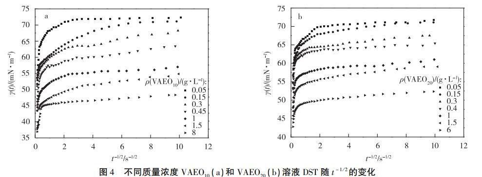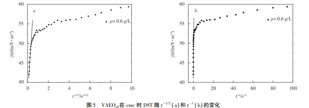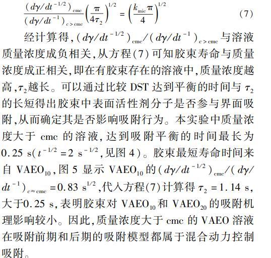 經(jīng)計算得,(dγ/dt-1/2)cmc/(dγ/dt-1)c>cmc與溶液質(zhì)量濃度成負相關(guān),從方程(7)可知膠束壽命與質(zhì)量濃度成正相關(guān),即在有膠束存在的溶液中,質(zhì)量濃度越高,τ2越長。可以通過比較DST達到平衡的時間與τ2的長短得出膠束中表面活性劑分子是否參與界面吸附,從而確定其是否影響吸附行為。本實驗中質(zhì)量濃度大于cmc的溶液,達到吸附平衡的時間最長為0.25s(t-1/2=2s-1/2,見圖4)。膠束最短壽命時間來自VAEO10,圖5顯示VAEO10的(dγ/dt-1/2)cmc/(dγ/dt-1)c≈cmc=0.83s1/2,代入方程(7)計算得τ2=1.14s,大于0.25s,表明膠束對VAEO10和VAEO20的吸附機理影響較小。因此,質(zhì)量濃度大于cmc的VAEO溶液在吸附前期和后期的吸附模型都屬于混合動力控制吸附。