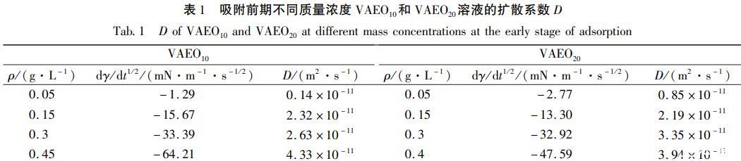 在初始吸附階段,表面層VAEO分子很少,可以用方程(2)來表述表面張力與時間的關(guān)系,對非離子表面活性劑,式中n=1.以y(t)對t/2作圖,結(jié)果見圖3.短時間內(nèi)γ(t)與t1/2成直線關(guān)系,直線截距對應(yīng)溶劑的表面張力,擴散系數(shù)D可由直線斜率求出,結(jié)果見表1.