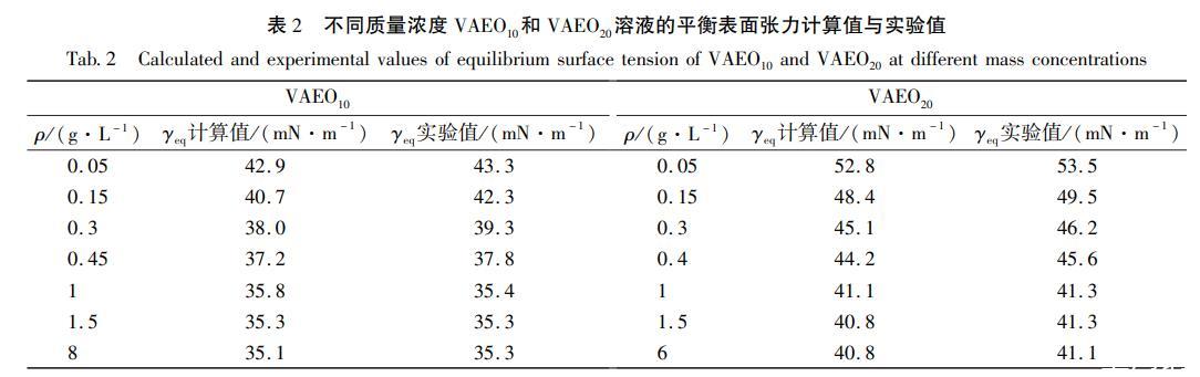 從以上對VAEO10和VAEO20在氣/液界面的吸附行為的研究可知,當質(zhì)量濃度小于cmc時,二者在吸附前期均表現(xiàn)為擴散控制吸附,擴散系數(shù)D的數(shù)量級為10-11m2/s,在吸附后期均為混合動力控制吸附,表觀擴散系數(shù)Da的數(shù)量級為10-12m2/s.膠束存在時,τ2較長,大于到達γeq所需時間teq,膠束形成不影響表面張力隨時間的變化趨勢。據(jù)文獻報道,壬基酚聚氧乙烯醚(NPEO9)濃度小于cmc時的擴散系數(shù)為3.9×10-10m2/s(滴體積法),平衡表面張力為30.6mN/m,可推測NPEO10的擴散系數(shù)在3.9×10-10m2/s附近,大于本研究中VAEO10的擴散系數(shù)。VAEO的疏水部分分子結(jié)構(gòu)比NPEO的大,前者較后者多一個縮醛環(huán)和一個甲氧基,這兩個基團一方面造成VAEO的空間體積較大,另一方面,縮醛環(huán)中的——O-與水分子可能形成氫鍵,均增加了VAEO擴散時的阻力,因而降低了擴散速率。