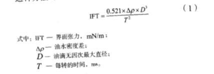 采用芬蘭Kibron dIFT雙通道動態(tài)界面張力儀進(jìn)行界面張力測定。此張力儀的原理是:液滴通過旋轉(zhuǎn)處于一定的離心場中,這時(shí)兩種液體之間的界面張力及旋轉(zhuǎn)的速度就決定了液滴的形狀,液滴的平衡形狀通過調(diào)整轉(zhuǎn)速得到改變,而使液滴以一定的角速度自轉(zhuǎn),這時(shí)通過離心力、重力以及界面張力的三種力量的共同作用下,在高密度的液體中,低密度的液滴能夠形成圓柱形或長橢球形液滴。這種方法可以測定出10-6mN/m的超低界面張力。
