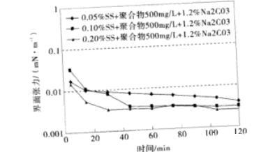 圖1石油磺酸鹽+聚合物500 mg/L+1.2%Na2CO3復(fù)配體系的動態(tài)界面張力(mN/m)
