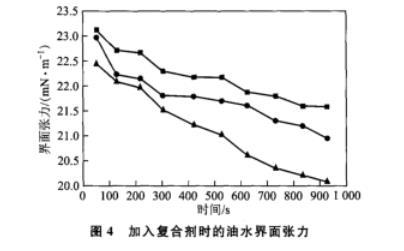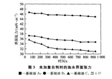 由圖3可以看出:未加復合劑時,基礎油A的界面張力最大,基礎油B的界面張力次之,基礎油C的界面張力最小;隨著時間的延長,不同基礎油的界面張力均逐漸降低,基礎油中芳烴和膠質等極性組分含量越大,界面張力越低,最后達到一個平衡值。這是因為,隨著時間的延長,基礎油中的活性物質逐漸吸附到油水界面上,導致界面張力逐漸下降,最終達到吸附與脫附的動態平衡,界面張力基本不變。從圖3還可以看出,隨著基礎油中極性組分含量的增大,界面張力達到平衡值的時間增加。這可以解釋為基礎油的極性組分含量越大,在組分分子的擴散交換速率差異較小的情況下,達到吸附-脫附平衡的時間越長。