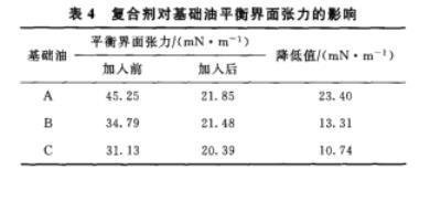 表4為復合劑對基礎油平衡界面張力的影響。從表4可以看出,復合劑的加入導致不同基礎油界面張力下降的程度差異較大,其中基礎油A的油水界面張力下降程度最大,基礎油B的油水界面張力下降程度居中,基礎油C的油水界面張力下降程度最小。這可能是由表面活性劑和基礎油所含極性組分在油水界面上的競爭吸附所導致的,基礎油所含極性組分越多,在界面上的吸附量越大,表面活性劑分子吸附到油水界面的量就越少,而表面活性劑比基礎油所含極性組分的活性高,所以綜合表現為其界面張力降低值越小。