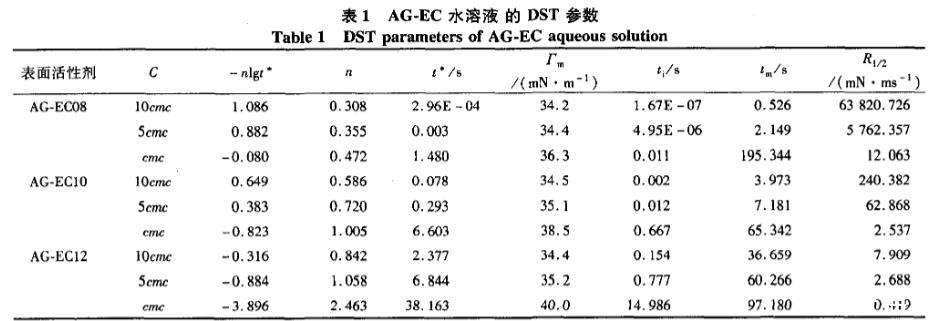 在25cc下測定不同濃度AG.EC水溶液的DST,并利用Rosen模型處理,得到其動態表面張力參數,見圖4、表1。