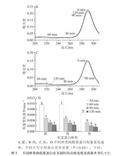 鹽酸胍誘導(dǎo)肌漿蛋白變性的熒光光譜如圖1A~C所示,3種肌漿蛋白都在290 nm波長處達(dá)到最大吸光度,由于酪氨酸主要對250~290 nm波長范圍內(nèi)具有吸收。由肌漿蛋白氨基酸組成可知,雞肉肌漿蛋白的酪氨酸含量最高,這也解釋了在第0分鐘時雞肉肌漿蛋白的吸光度相比較而言達(dá)到最大。而且豬肉和魚肉肌漿蛋白在第120分鐘時達(dá)到最大吸光度,這說明肌漿蛋白三級結(jié)構(gòu)改變時,構(gòu)象發(fā)生重排且構(gòu)象展開,而雞肉肌漿蛋白在第120分鐘時吸光度有所下降,說明雞肉肌漿蛋白結(jié)構(gòu)改變較快。由圖1D可知,隨著時間的延長,構(gòu)象變化速率越來越小,并且在相同時間下,豬肉肌漿蛋白與雞肉肌漿蛋白的峰值變化速率無顯著差異(P>0.05),而魚肉肌漿蛋白峰值變化速率相比較而言顯著較慢(P<0.05)。這一結(jié)果表明,和魚肉肌漿蛋白相比,豬肉和雞肉的肌漿蛋白構(gòu)象柔順性更好。