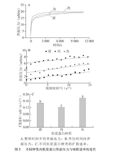 由圖2可知,不同種類肌漿蛋白的動力學(xué)擴(kuò)散速率間存在差異性。蛋白質(zhì)分子在界面上的擴(kuò)散速率受其粒徑大小的影響,而本實驗結(jié)果更能解釋這一現(xiàn)象。在前述理化指標(biāo)中,粒徑大小為雞肉肌漿蛋白>豬肉肌漿蛋白>魚肉肌漿蛋白,而在本部分?jǐn)U散速率大小為雞肉肌漿蛋白<豬肉肌漿蛋白<魚肉肌漿蛋白。這可能是由于大粒徑的肌漿蛋白產(chǎn)生的空間位阻在一定程度上削弱了表面疏水性提高帶來的吸附速率增加。而且魚肉肌漿蛋白的擴(kuò)散速率較豬肉和雞肉肌漿蛋白間顯著較大(P<0.05),但雞肉與豬肉肌漿蛋白之間的擴(kuò)散速率卻無顯著性差異(P>0.05)。