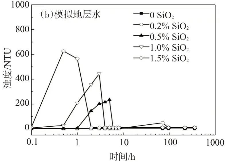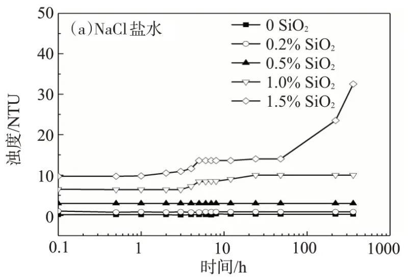 用模擬地層水配制的納米SiO2/SDS體系經(jīng)歷了澄清透明-渾濁-沉降的3個階段,靜置初始,納米SiO2質(zhì)量分數(shù)為0.5%的體系的濁度不隨時間的延長而變化,表明此時體系穩(wěn)定;靜置1 h后,濁度明顯增加;靜置6 h后,體系的濁度又恢復(fù)到了初始值,由于實驗測試的是樣品上半部分的濁度,說明此時體系已經(jīng)完全沉降。
