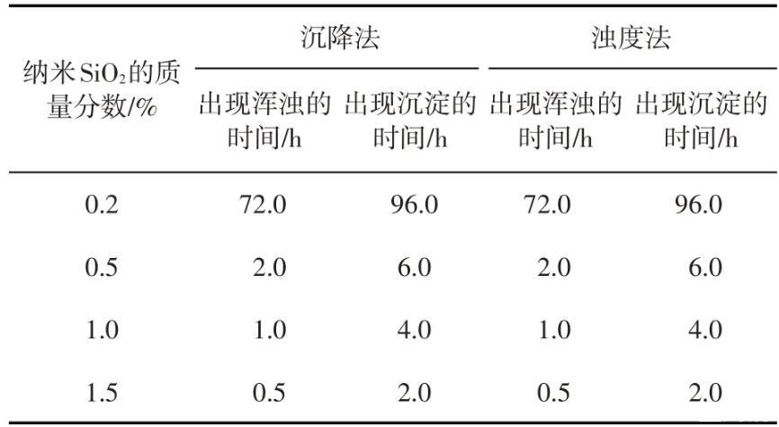 表1模擬地層水中納米SiO2/SDS體系出現(xiàn)渾濁、沉淀的時間(SDS質(zhì)量分數(shù)為0.3%)