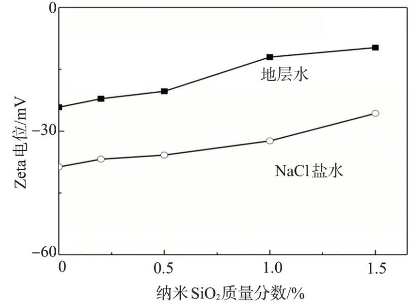 圖2給出了分別用模擬地層水和NaCl鹽水配制的不同納米SiO2含量的納米SiO2/SDS體系的Zeta電位。當納米SiO2的質(zhì)量分數(shù)分別為0.2%、0.5%和1.0%時,用NaCl鹽水配制的納米SiO2/SDS體系的|ζ|均大于30 mV,因而表現(xiàn)出較好的穩(wěn)定性;而當納米SiO2質(zhì)量分數(shù)為1.5%時,體系的|ζ|略低于30 mV,因此納米SiO2/SDS體系在靜置15 d后才出現(xiàn)輕微的混濁。用模擬地層水配制的納米SiO2/SDS體系的|ζ|均明顯小于30 mV,說明體系的穩(wěn)定性差,靜置幾小時即出現(xiàn)了渾濁和沉淀。納米SiO2帶負電,金屬陽離子Ca2+,Mg2+和Na+等的存在會壓縮納米SiO2的雙電層,由于Ca2+,Mg2+離子的價數(shù)高,壓縮雙電層的能力強,導(dǎo)致體系的|ζ|降低,穩(wěn)定性變差,由此可見,要使納米SiO2/SDS分散體系具有良好的穩(wěn)定性,應(yīng)減少體系中二價Ca2+、Mg2+的含量。