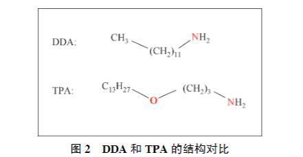 試驗所用藥劑NaOH、H?SO?均購于廣州試劑廠;DDA購于上海阿拉丁生化科技股份有限公司,TPA為工業來源藥劑,購買自山東派尼新材料股份有限公司。試驗用水為超純水,電阻率為18.25 MΩ·cm。捕收劑結構如圖2所示。