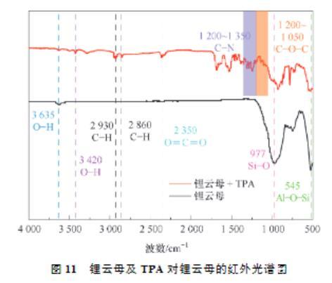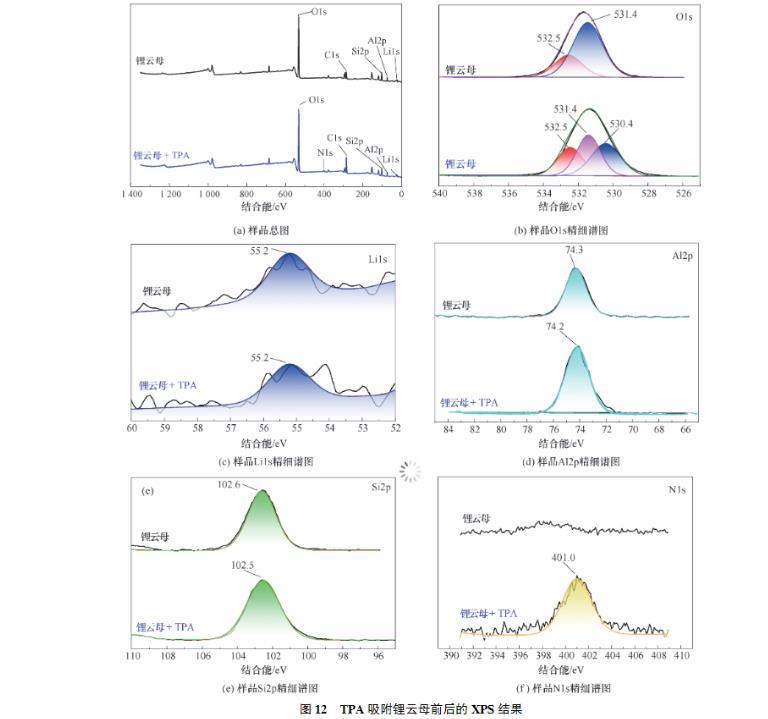 (2)接觸角試驗表明,同等條件下,TPA作用鋰云母的接觸角總是大于DDA,展現(xiàn)了TPA更強的疏水性。Zeta電位測試結(jié)果表明,TPA及DDA在鋰云母表面的吸附為靜電吸附,并且碳鏈更長的TPA由于疏水效應(yīng)吸附性更好,進一步證明了TPA的強疏水性。FTIR及XPS進一步證實了TPA吸附在鋰云母表面。