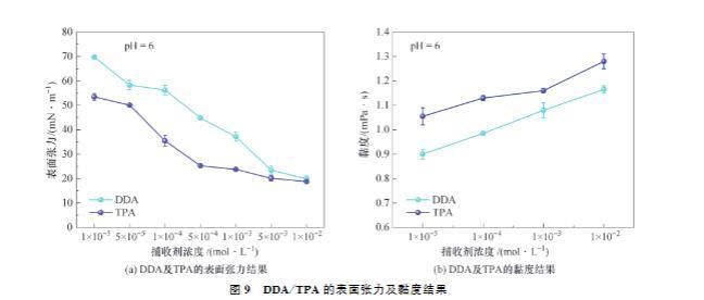 DDA及TPA的黏度結(jié)果如圖9(b)所示。由圖9(b)可知,弱酸性條件下,DDA或TPA的黏度均隨著捕收劑用量的增加而增大,這說明DDA或TPA均能增強溶液黏度。當(dāng)捕收劑濃度一致時,TPA的黏度總是大于DDA,這說明較高黏度的TPA具有更穩(wěn)定