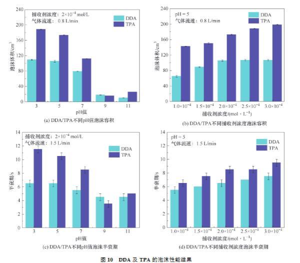 (3)在不同濃度下,TPA均得到比DDA更低的表面張力,說明TPA可能具有更多的泡沫容積,泡沫容積結(jié)果驗證了表面張力結(jié)果。在不同濃度下,TPA均得到比DDA更高的黏度,說明TPA產(chǎn)生的泡沫更穩(wěn)定,泡沫半衰期結(jié)果驗證了黏度結(jié)果。表面張力試驗、黏度試驗、泡沫容積試驗、泡沫半衰期試驗共同證明TPA更優(yōu)越的泡沫性能。將TPA應(yīng)用于浮選中,能夠增大氣泡與鋰云母的碰撞及接觸概率,增強鋰云母與氣泡的黏附,減少鋰云母與氣泡的脫附,進而提高浮選回收率。