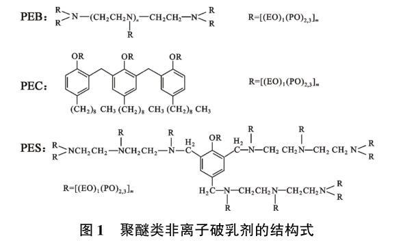 實(shí)驗(yàn)用破乳劑HY01是季銨鹽類陽離子破乳劑,相對(duì)分子質(zhì)量約6 000,固含量約35%;其他破乳劑為聚醚類非離子表面活性劑,平均相對(duì)分子質(zhì)量均在5 000左右,EO(乙氧基)∶PO(丙氧基)=1∶2.3。3種聚醚類非離子破乳劑的結(jié)構(gòu)式見圖1,其中PEB是支狀聚醚類非離子破乳劑,屬于多乙烯多胺聚氧乙烯聚氧丙烯醚型破乳劑,PEC是梳型聚醚類非離子破乳劑,屬于酚醛樹脂聚氧乙烯聚氧丙烯醚型破乳劑,PES是星型聚醚類非離子破乳劑,屬于酚胺醛樹脂聚氧乙烯聚氧丙烯醚型破乳劑。