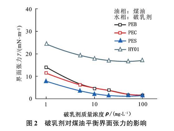 圖2破乳劑對(duì)煤油平衡界面張力的影響