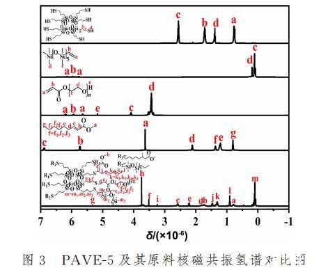 采用核磁共振氫譜對所制備復合材料的化學結構進一步表征分析。圖3為PAVE-5以及其原料的核磁共振對比圖。PAVE-5譜圖中,SH-POSS的-SH質子氫吸收峰已經消失,接枝成功的APEG400烯烴雙鍵的質子氫吸收峰已經明顯消失,末端連接的-OH質子氫吸收峰在5.32x10-6處;同樣反應成功的2-壬烯酸甲酯單體,烯烴雙鍵的質子氫吸收峰也同樣消失不見,連接O的末端烷烴-CH3質子氫吸收峰處于3.75x 10-6的位置;最后成功反應的VDMS單體,烯烴雙鍵的質子氫吸收峰也已經消失,Si上連接的所有甲基CH3分別處在0.09x10-6和0.14x10-6處,可以得知PAVE-5成功合成。