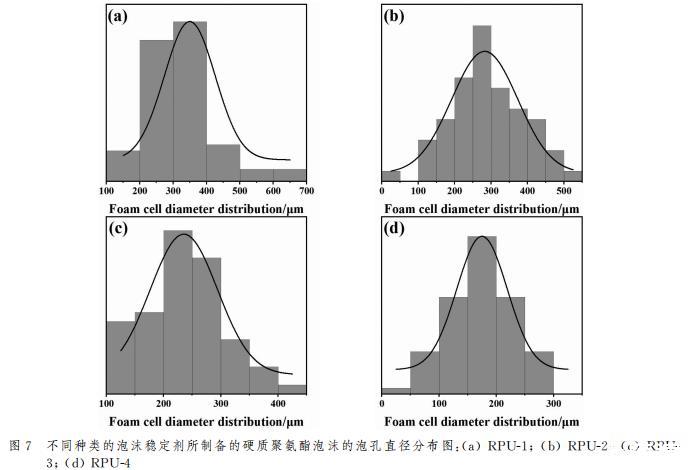 為了對聚氨酯泡沫孔徑大小和分布情況進行量化,通過ImageJ軟件對SEM測試結果進行處理分析,其孔徑分布直方圖如圖7所示。通過泡沫的孔徑分布直方圖對比結果可以看出,添加國產-1的聚氨酯泡沫孔徑分布范圍在100~700μm,存在較大直徑的泡孔,添加進口-2的聚氨酯泡沫泡孔直徑分布范圍在0~550μm,雖然分布范圍有變窄,但也存在較大泡孔直徑,添加PAVE-5的聚氨酯泡沫泡孔直徑分布范圍在100~450μm,泡孔分布范圍減小,但仍然存在超過400μm的大泡孔,分布范圍最窄的是添加PGVF-6泡沫穩定劑的硬質聚氨酯泡沫,分布范圍在0~300μm,沒有超過400μm直徑的泡孔,泡沫泡孔直徑得以減小,泡沫泡孔細小均勻。這種微觀結構上的改善可能得益于在發泡過程中,接枝APEG的POSS可以作為三維網絡結構的交聯點,通過其與聚氨酯基體的相容性,親水性-OH基團有助于形成更加穩定的泡沫結構。