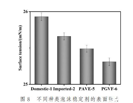 聚氨酯泡沫具有理想泡孔結構的前提是在發泡過程中所形成的氣泡具有良好的穩定性,避免氣泡合并或者破裂。因此合適的泡沫穩定劑應該具備適宜的表面張力,才能有效提升氣泡穩定性進而獲得均勻且細密的泡孔結構。為此對所使用的泡沫穩定劑進行了表面張力測試,結果如圖8所示。通過測試結果可以看出,國產-1的表面張力為25.93mN/m,進口-2的表面張力為25.66 mN/m,PAVE-5的表面張力在25.49 mN/m,而PGVF-6的表面張力進一步得到降低,為25.31mN/m,這主要是因為PGVF-6和PAVE-5特有的疏水性硅氧烷結構有助于降低表面張力,并且PGVF-6相較于PAVE-5具有更長的聚醚鏈段的同時,其鏈段中間分布著疏水基團,這些疏水基團在氣液界面上傾向于排列在氣相一側,從而減少液相中的分子間作用力,導致表面張力的降低。此外分子鏈越長,這可能增強其在界面上的鋪展能力,進而更有效地降低表面張力。官能度的提高,即分子中羥基數量的增加,可以增加分子與空氣界面的接觸點,增強其在界面上的吸附能力,從而進一步降低表面張力。