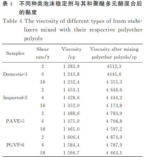 表4不同泡沫穩定劑與對應聚醚多元醇混合后的黏度