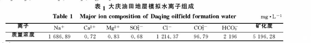 實驗用油樣為大慶原油與煤油按體積比9∶1混合而成(簡稱模擬油)。其中,大慶原油酸值為0.05 mg KOH/g;煤油由北京燕山石油化工有限公司提供,實驗前用活化后的硅膠反復吸附處理,處理后與二次蒸餾水界面張力大于48mN·m—1.實驗用Na2CO3弱堿溶液(簡稱Na2CO3溶液)由Na2CO3與蒸餾水配置,質(zhì)量分數(shù)為0.53%.實驗用水樣為大慶油田地層模擬水(簡稱模擬水),離子組成見表1.實驗所用試劑NaCl、Na2CO3、NaHCO3、CaCl2、MgSO4均為分析純。