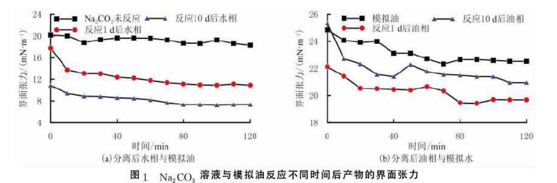 在Na2CO3溶液與模擬油反應1d和10d后,分離得到的水相及油相分別與模擬油及模擬水間的界面張力隨測定時間關(guān)系見圖1.由圖1(a)可以看出,Na2CO3溶液和模擬油反應1d及10d后分離出的水相與模擬油的界面張力,比未反應Na2CO3溶液與模擬油的界面張力低,且隨著反應時間增加,水相與模擬油的界面張力降低。這說明模擬油中酸性物質(zhì)與Na2CO3溶液反應生成的部分界面活性物質(zhì)具有較好的水溶性。水溶性的界面活性物質(zhì)在油水界面處吸附,使分離出的水相與模擬油界面張力降低;隨著反應時間的增加,所生成的界面活性物質(zhì)增多,分離出的水相與模擬油的界面張力降低幅度增大。