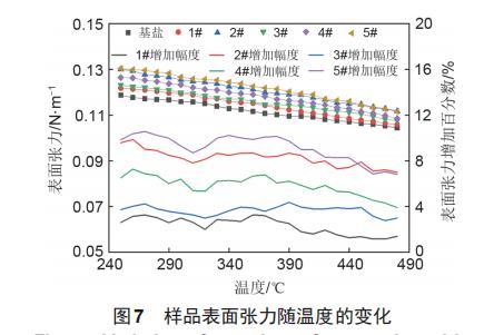 樣品的表面張力值隨溫度變化如圖7所示。可以看到,在250~480℃內(nèi),基鹽的表面張力在0.1044~0.1188N/m,表面張力隨溫度的升高呈下降趨勢。1#納米熔鹽的表面張力在0.1059~0.1219N/m,對數(shù)據(jù)進行擬合后,擬合系數(shù)在0.995以上,擬合程度較好。2#納米熔鹽的表面張力在0.1117~0.1301N/m,擬合系數(shù)為0.996,隨溫度變化的趨勢和基鹽及一般熔鹽表面張力的變化趨勢保持一致,均隨溫度的升高呈下降趨勢。3#和4#納米熔鹽的表面張力在0.1075~0.1232 N/m和0.1085~0.1265 N/m,擬合系數(shù)都在0.994以上,其中4#納米熔鹽的擬合系數(shù)與2#納米熔鹽的擬合系數(shù)相同,均為0.996,擬合程度最好。5#納米熔鹽的表面張力在0.1115~0.1305N/m,擬合系數(shù)為0.991。