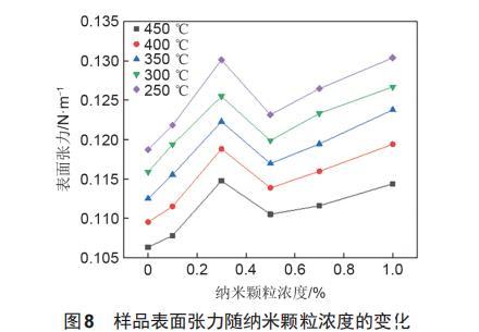 圖8為不同溫度工況點下樣品表面張力隨納米顆粒濃度的變化情況。