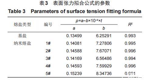 利用拉筒法對配制的基鹽及5種加入30nm SiO2納米顆粒的納米熔鹽的表面張力進行測量,每隔10℃進行一次測量,對得到的實驗數(shù)據(jù)進行整理和分析,擬合公式以及擬合系數(shù)見表3。