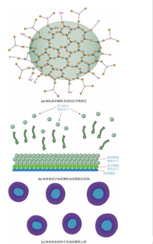 (4)采用高溫熔融法制備納米熔鹽時,由于SiO2納米顆粒表面缺少配位的原子,熔融鹽分子會在SiO2納米顆粒周圍先形成化學(xué)吸附層,隨后由于攪拌的作用,形成物理吸附層,最終以納米云核的形式存在于熔鹽體系中。