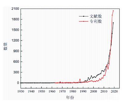 圖2氣凝膠論文與專利發表數量與年度趨勢圖,數據統計于web of science