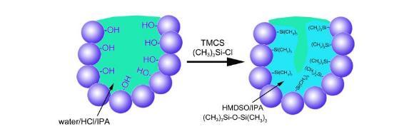 如圖6所示,采用三甲基氯硅烷(trimethyl chlorosilane,簡稱TMCS)對氧化硅凝膠孔壁表面進行疏水化處理,可實現常壓干燥制備氣凝膠。其中TMCS和異丙醇(isopropanol,簡稱IPA)分別作為疏水化試劑和溶劑。TMCS與靠近顆粒表面的孔反應,使孔壁表面的Si-OH轉化成硅甲基,有利于阻止水的吸附,形成孔表面疏水區域。同時,TMCS水解縮合生成六甲基二硅氧烷(hexamethyldisiloxane,簡稱HMDSO),且不與水混溶,隨著反應的持續進行,水相逐漸從孔中排出,最終形成超疏水氣凝膠。