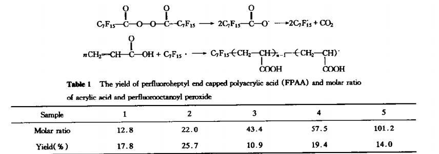 聚合反應是在溶劑CF_{2}CICF CI_{2}中進行的,大自由基將進行鏈轉移,單基或雙基終止反應,從而得出產物。反應步驟為在-17℃溫度下將50mL含有預定摩爾的全氟庚雙酰過氧化物的CF?CICFCI?溶液加入有氮氣保護裝置的反應器中,攪拌下加入已精制過的丙烯酸(密度1.0511g/mL),加熱并恒溫在45℃下反應10h,產物通過甲醇-乙酸乙酯溶劑體系重結晶并置真空烘箱中干燥,稱重并計算產率(如表1)。