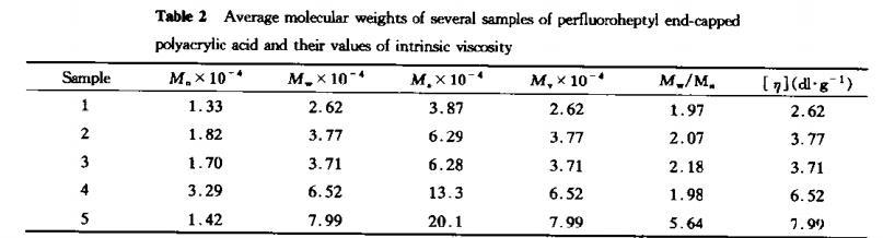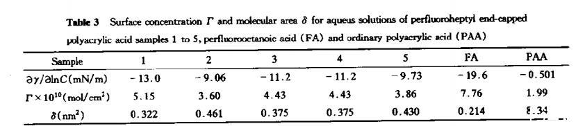 由表3可見,聚丙烯酸(分子量2.5x10?)在水溶液中界面活性極低(數據引自文獻),每個PAA分子對空氣-水界面的覆蓋十分松散,全氟庚酸分子所占約0.21nm2,接近全氟烷烴緊密排列的分子軸截面積,而FPAA每個分子所占據的表面面積在0.32~0.46nm2之間,形成尾形鏈構象的刷狀結構。全氟端基的引入,顯著改變了PAA分子在界面的構象,由于全氟烴的憎水特性,在水溶液中趨于向水空氣界面的吸附,從而極大的提高了界面活性,降低了界面能。