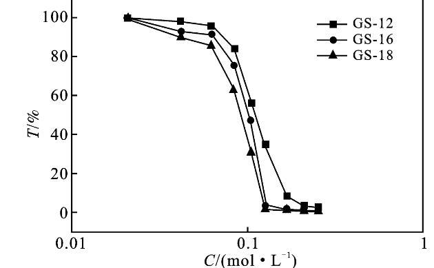 2.2.2耐鹽性能隨著鹽濃度的增加,濁度的突然增加是表面活性劑溶液中宏觀相分離的標志,這就是鹽析現象[7,11]。圖4為KBr/GS表面活性劑溶液,隨著KBr含量的增加,在波長為500 nm的吸光度變化曲線。以GS-12為例,當KBr濃度為0~60 mmol/L時,1 mmol/L的Gemini表面活性劑水溶液為無色透明,濁度同時略有下降,說明有混合膠束形成。當KBr的濃度從60 mmol/L增加到120 mmol/L時,溶液呈現微渾濁,說明體系中有少量的表面活性劑顆粒析出。而GS-16,GS-18在更低的濃度下就發生了鹽析現象。也就是說,鹽的析出現象是非常復雜的,這不僅取決于鹽的性質,而且取決于雙子表面活性劑的結構[12-13]。此外,由圖4透過率的變化可知,隨著疏水鏈的增長,表面活性劑的耐鹽性能減弱,更容易受鹽濃度的影響。因為無機鹽消除離子頭基團的電荷,減少吸附膜內頭基基團與膠束之間的靜電排斥。它們通過減少頭基之間的靜電相互作用和最小化有效截面積來促進膠束的產生和聚集,導致表面活性劑從溶液中聚沉而析出[13]。