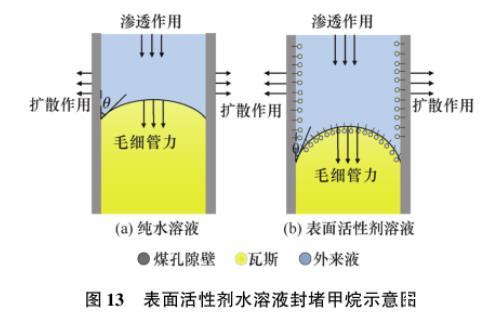 毛細管力與溶液表面張力成正比、與孔隙半徑成反比;同時,接觸角越小,毛細管力越大。由表5可知,朱鍇[21]試驗并計算煤樣10 nm孔徑的毛細力,發現自配的表面活性劑水溶液能夠使毛細力平均提高2倍,最大提高4.03倍。如圖13所示,在擴散、滲透和毛細力共同作用下,表面活性劑水溶液沿著煤體表面、孔隙和裂隙進入煤體內部產生液相滯留效應,增大煤潤濕效果的同時其內部瓦斯流動阻力變大,孔隙內瓦斯氣體被水溶液封堵。因此,添加活性劑水溶液能夠減小水溶液的表面張力、降低水溶液與煤之間的接觸角,增強煤的潤濕效果,達到抑制煤層瓦斯的解吸、延緩采動煤巖體中瓦斯逸散的目的,從而降低開采工作面瞬時瓦斯涌出量。也有學者[21,29,32]分析認為,添加表面活性劑水溶液會降低煤體溫度、增強煤吸附瓦斯的能力,使得部分游離態瓦斯轉變為吸附態,相應地減少了瓦斯氣體的逸散涌出。