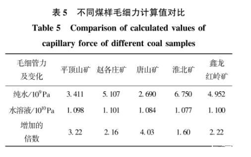 表5不同煤樣毛細力計算值對比