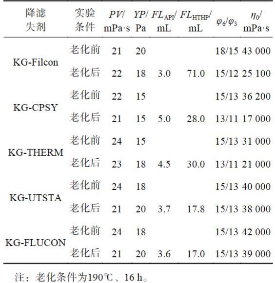 為避免超高溫下材料間的相互影響干擾判斷,室內在190℃下先固定KG-TNJ作為增黏劑材料不變,對5種改性淀粉類高溫降濾失劑材料進行了初選。其中,KG-Filcon為海上常用抗高溫改性淀粉;KG-CPSY和KG-THERM均為聚合物接枝改性抗高溫淀粉;KG-UTSTA和KG-FLUCON均為室內使用2-丙烯酰胺基-2-甲基丙磺酸AMPS、聚苯乙烯乳液與可溶性淀粉在堿性條件下通過接枝共聚生成抗超高溫改性淀粉,2者區別在于KG-UTSTA為機械攪拌條件下共聚合成,KG-FLUCON為超聲波機械協同方式混勻后再進行合成。評價配方:基礎配方+1.0%KG-TNJ+2.5%降濾失劑,實驗結果見表2。由表2可知,190℃老化后,各體系的流變性能穩定,KG-UTSTA和KG-FLUCON體系的高溫高壓降濾失性最好,濾失量小于20 mL,KG-CPSY和KG-THERM體系的高溫高壓降濾失性能次之。分析原因為改性淀粉都引入了抗高溫接枝共聚單體,但是KG-FLUCON、KG-UTSTA除了引入AMPS類抗高溫單體外,還引入聚苯乙烯乳液,增加了接枝改性的抗高溫基團和空間結構,通過聚苯乙烯乳液組分的吸附、滲透、覆蓋包裹特性增強了對淀粉結構的高溫保護作用和產物的成膜封堵性能,改善了其抗高溫性和濾失造壁。